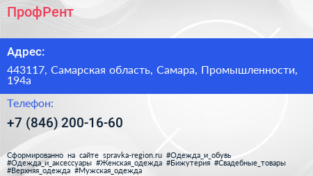 ПрофРент по адресу 443117, Самарская область, Самара, Промышленности, 194а в дальнейшем Организация, размещена в следующих категориях: