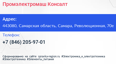 Промэлектромаш-Консалт по адресу 443080, Самарская область, Самара, Революционная, 70е в дальнейшем Организация, размещена в следующих категориях: