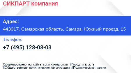 СИКПАРТ, компания по адресу 443017, Самарская область, Самара, Южный проезд, 15 в дальнейшем Организация, размещена в следующих категориях: