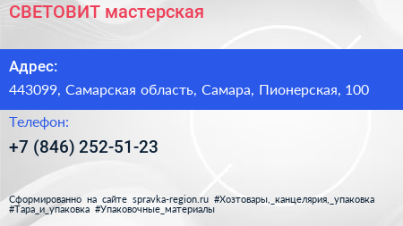 СВЕТОВИТ, мастерская по адресу 443099, Самарская область, Самара, Пионерская, 100 в дальнейшем Организация, размещена в следующих категориях: