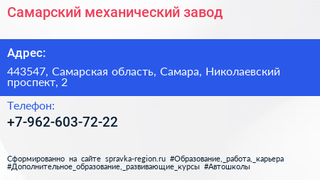 Самарский механический завод по адресу 443547, Самарская область, Самара, Николаевский проспект, 2 в дальнейшем Организация, размещена в следующих категориях: