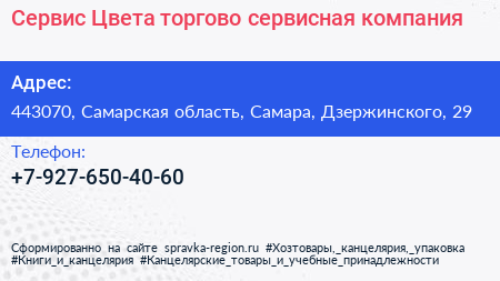 Сервис Цвета, торгово-сервисная компания по адресу 443070, Самарская область, Самара, Дзержинского, 29 в дальнейшем Организация, размещена в следующих категориях: