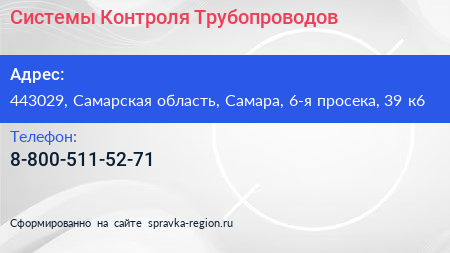 Системы Контроля Трубопроводов по адресу 443029, Самарская область, Самара, 6-я просека, 39 к6 в дальнейшем Организация, размещена в следующих категориях: