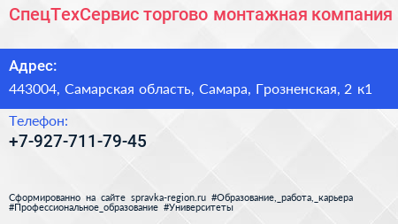 СпецТехСервис, торгово-монтажная компания по адресу 443004, Самарская область, Самара, Грозненская, 2 к1 в дальнейшем Организация, размещена в следующих категориях: