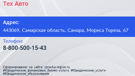 Тех-Авто по адресу 443069, Самарская область, Самара, Мориса Тореза, 67 в дальнейшем Организация, размещена в следующих категориях: