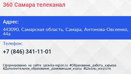 360-Самара, телеканал по адресу 443090, Самарская область, Самара, Антонова-Овсеенко, 44а в дальнейшем Организация, размещена в следующих категориях:
