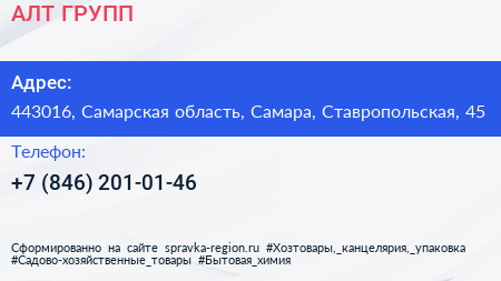АЛТ ГРУПП по адресу 443016, Самарская область, Самара, Ставропольская, 45 в дальнейшем Организация, размещена в следующих категориях: