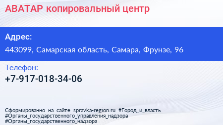 АВАТАР, копировальный центр по адресу 443099, Самарская область, Самара, Фрунзе, 96 в дальнейшем Организация, размещена в следующих категориях: