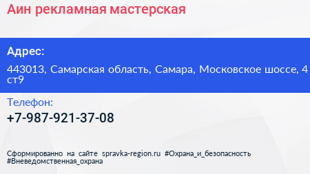 Аин, рекламная мастерская по адресу 443013, Самарская область, Самара, Московское шоссе, 4 ст9 в дальнейшем Организация, размещена в следующих категориях: