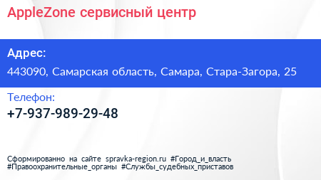 AppleZone, сервисный центр по адресу 443090, Самарская область, Самара, Стара-Загора, 25 в дальнейшем Организация, размещена в следующих категориях: