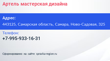Артель, мастерская дизайна по адресу 443125, Самарская область, Самара, Ново-Садовая, 325 в дальнейшем Организация, размещена в следующих категориях: