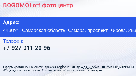 BOGOMOLoff, фотоцентр по адресу 443091, Самарская область, Самара, проспект Кирова, 283 в дальнейшем Организация, размещена в следующих категориях: