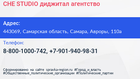 CHE-STUDIO, диджитал-агентство по адресу 443069, Самарская область, Самара, Авроры, 110а в дальнейшем Организация, размещена в следующих категориях: