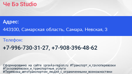 Че/Бэ Studio по адресу 443100, Самарская область, Самара, Невская, 3 в дальнейшем Организация, размещена в следующих категориях: