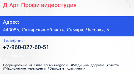 Д-Арт Профи, видеостудия по адресу 443086, Самарская область, Самара, Часовая, 6 в дальнейшем Организация, размещена в следующих категориях: