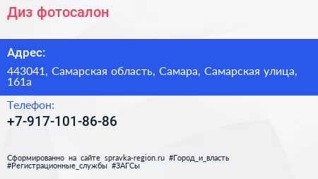 Диз, фотосалон по адресу 443041, Самарская область, Самара, Самарская улица, 161а в дальнейшем Организация, размещена в следующих категориях: