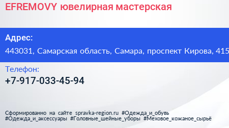 EFREMOVY, ювелирная мастерская по адресу 443031, Самарская область, Самара, проспект Кирова, 415 в дальнейшем Организация, размещена в следующих категориях: