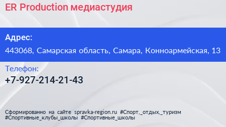 ER-Production, медиастудия по адресу 443068, Самарская область, Самара, Конноармейская, 13 в дальнейшем Организация, размещена в следующих категориях:
