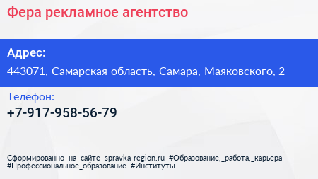 Фера, рекламное агентство по адресу 443071, Самарская область, Самара, Маяковского, 2 в дальнейшем Организация, размещена в следующих категориях: