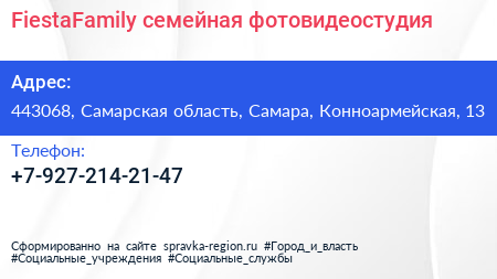 FiestaFamily, семейная фотовидеостудия по адресу 443068, Самарская область, Самара, Конноармейская, 13 в дальнейшем Организация, размещена в следующих категориях: