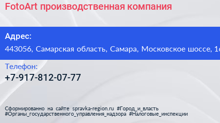 FotoArt, производственная компания по адресу 443056, Самарская область, Самара, Московское шоссе, 16 в дальнейшем Организация, размещена в следующих категориях: