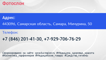 Фотослон по адресу 443096, Самарская область, Самара, Мичурина, 50 в дальнейшем Организация, размещена в следующих категориях:
