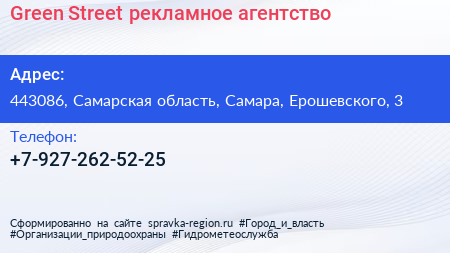 Green Street, рекламное агентство по адресу 443086, Самарская область, Самара, Ерошевского, 3 в дальнейшем Организация, размещена в следующих категориях: