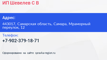 ИП Шевелев С.В. по адресу 443017, Самарская область, Самара, Мраморный переулок, 12 в дальнейшем Организация, размещена в следующих категориях: