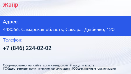 Жанр по адресу 443066, Самарская область, Самара, Дыбенко, 120 в дальнейшем Организация, размещена в следующих категориях: