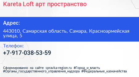 Kareta Loft, арт-пространство по адресу 443010, Самарская область, Самара, Красноармейская улица, 5 в дальнейшем Организация, размещена в следующих категориях: