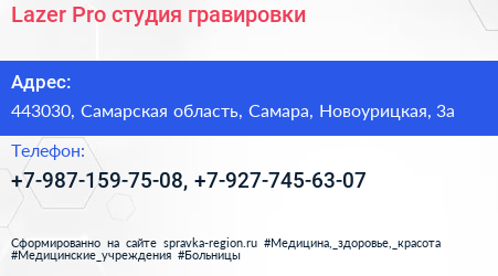 Lazer Pro, студия гравировки по адресу 443030, Самарская область, Самара, Новоурицкая, 3а в дальнейшем Организация, размещена в следующих категориях: