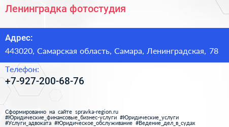 Ленинградка, фотостудия по адресу 443020, Самарская область, Самара, Ленинградская, 78 в дальнейшем Организация, размещена в следующих категориях: