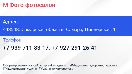 М-Фото, фотосалон по адресу 443548, Самарская область, Самара, Пионерская, 1 в дальнейшем Организация, размещена в следующих категориях: