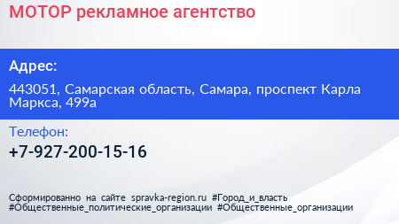 МОТОР, рекламное агентство по адресу 443051, Самарская область, Самара, проспект Карла Маркса, 499а в дальнейшем Организация, размещена в следующих категориях: