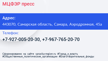 МЦФЭР-пресс по адресу 443070, Самарская область, Самара, Аэродромная, 45а в дальнейшем Организация, размещена в следующих категориях: