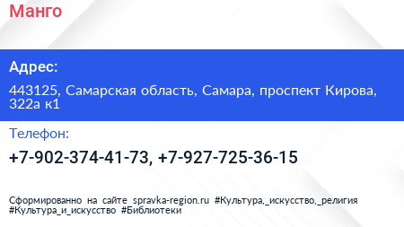 Манго по адресу 443125, Самарская область, Самара, проспект Кирова, 322а к1 в дальнейшем Организация, размещена в следующих категориях: