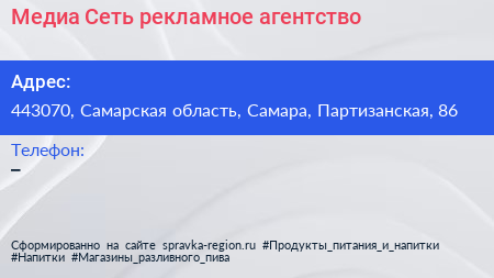 Медиа Сеть, рекламное агентство по адресу 443070, Самарская область, Самара, Партизанская, 86 в дальнейшем Организация, размещена в следующих категориях: