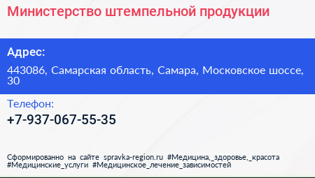 Министерство штемпельной продукции по адресу 443086, Самарская область, Самара, Московское шоссе, 30 в дальнейшем Организация, размещена в следующих категориях: