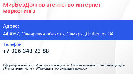 МирБезДолгов, агентство интернет-маркетинга по адресу 443067, Самарская область, Самара, Дыбенко, 34 в дальнейшем Организация, размещена в следующих категориях: