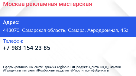 Москва, рекламная мастерская по адресу 443070, Самарская область, Самара, Аэродромная, 45а в дальнейшем Организация, размещена в следующих категориях: