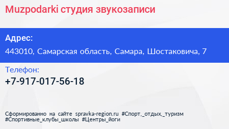 Muzpodarki, студия звукозаписи по адресу 443010, Самарская область, Самара, Шостаковича, 7 в дальнейшем Организация, размещена в следующих категориях: