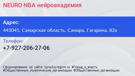 NEURO.NBA, нейроакадемия по адресу 443045, Самарская область, Самара, Гагарина, 82а в дальнейшем Организация, размещена в следующих категориях: