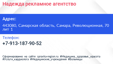 Надежда, рекламное агентство по адресу 443080, Самарская область, Самара, Революционная, 70 лит 1 в дальнейшем Организация, размещена в следующих категориях: