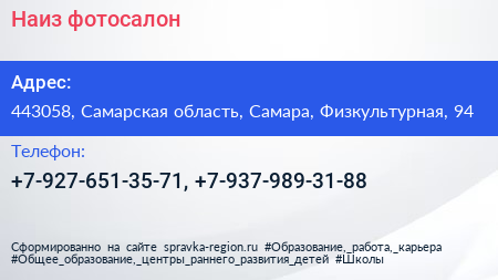 Наиз, фотосалон по адресу 443058, Самарская область, Самара, Физкультурная, 94 в дальнейшем Организация, размещена в следующих категориях: