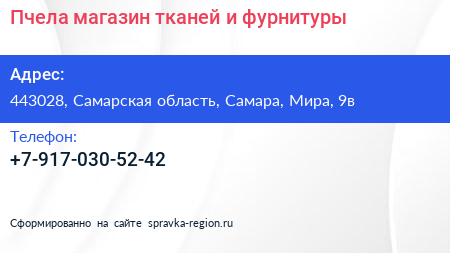 Пчела, магазин тканей и фурнитуры по адресу 443028, Самарская область, Самара, Мира, 9в в дальнейшем Организация, размещена в следующих категориях: