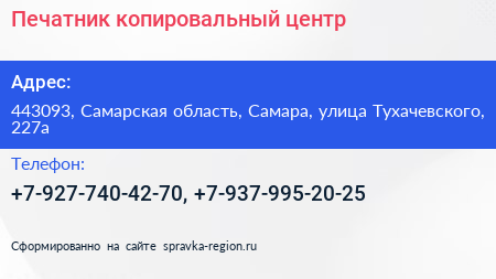 Печатник, копировальный центр по адресу 443093, Самарская область, Самара, улица Тухачевского, 227а в дальнейшем Организация, размещена в следующих категориях: