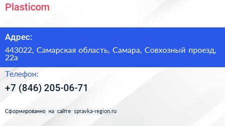 Plasticom по адресу 443022, Самарская область, Самара, Совхозный проезд, 22а в дальнейшем Организация, размещена в следующих категориях: