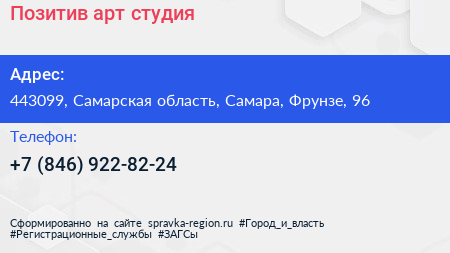 Позитив, арт-студия по адресу 443099, Самарская область, Самара, Фрунзе, 96 в дальнейшем Организация, размещена в следующих категориях: