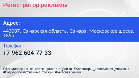 Регистратор рекламы по адресу 443087, Самарская область, Самара, Московское шоссе, 185а в дальнейшем Организация, размещена в следующих категориях:
