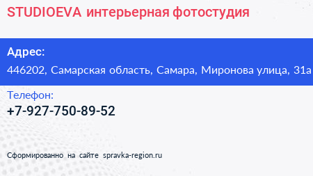 STUDIOEVA, интерьерная фотостудия по адресу 446202, Самарская область, Самара, Миронова улица, 31а в дальнейшем Организация, размещена в следующих категориях: